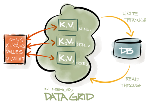 На рисунке ниже показан классический IMDG с набором ключей {k1, k2, k3}, где каждый ключ принадлежит разным узлам. Компонент внешней базы данных является необязательным. Если они присутствуют, то IMDG обычно автоматически считывают данные из базы данных или записывают в нее данные.