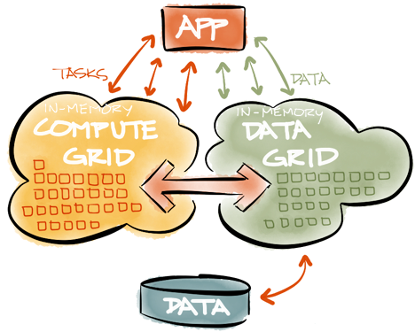 Типичное использование IMDG — разделение данных по кластеру и последующая отправка совмещенных вычислений на узлы, где находятся данные. Поскольку вычисления обычно являются частью Compute Grid и должны быть правильно развернуты, сбалансированы по нагрузке, перенесены при отказе или запланированы, интеграция между Compute Grid и IMDG очень важна. Это особенно выгодно, если и вычисления в памяти, и сетки данных являются частью одного продукта и используют одни и те же API, что устраняет необходимость интеграции и обычно обеспечивает максимальную производительность и надежность систем.