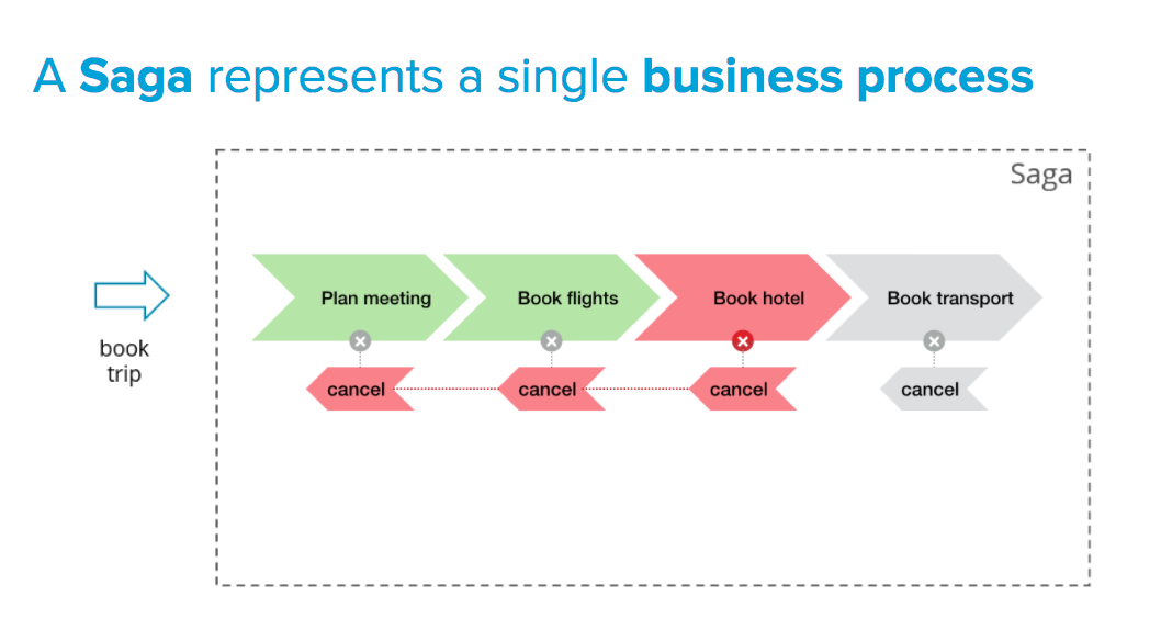 Сага представляет собой высокоуровневый бизнес-процесс (например, бронирование поездки), состоящий из нескольких низкоуровневых запросов, каждый из которых обновляет данные в рамках одной службы. У каждого запроса есть компенсирующий запрос, который выполняется в случае сбоя запроса или прерывания саги.