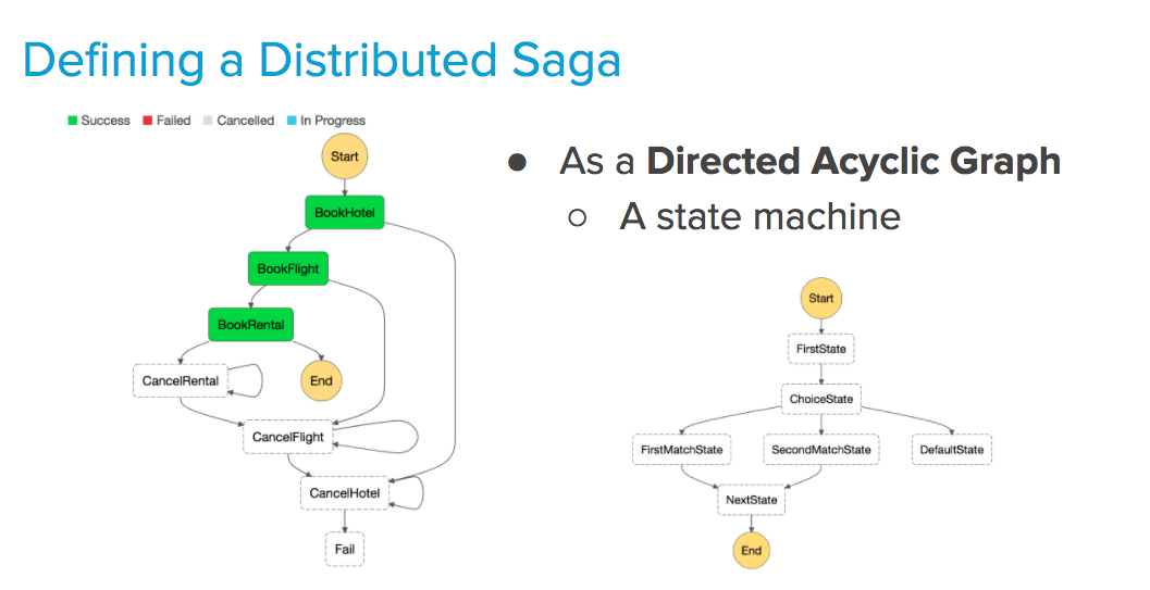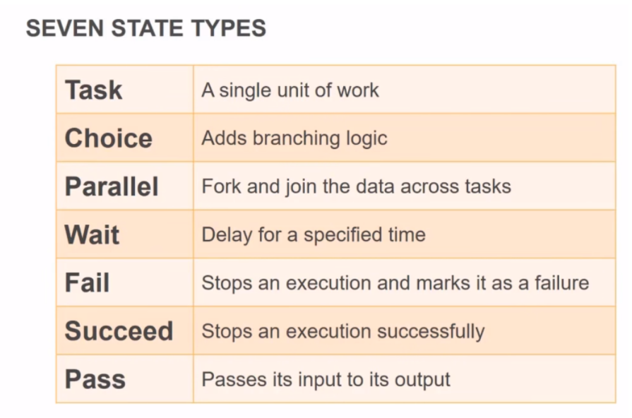 Существует семь типов состояний, которые вы можете использовать для создания конечного автомата. Task могут использоваться как запросы и запросы компенсации, а Choice и Parallel используется для потока управления.