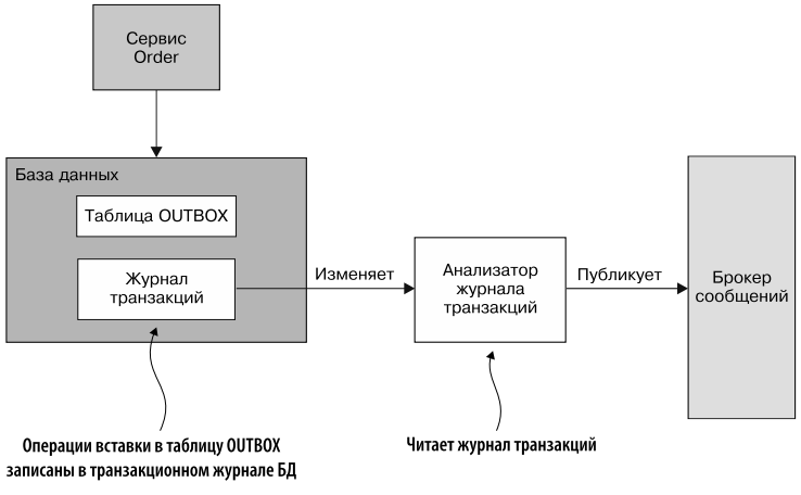2. Анализатор журнала транзакций читает записи в транзакционном журнале. Каждую подходящую запись, он преобразует в событие и публикует его для брокера (в виде сообщения), чтобы следующий по цепочке сервис смог обработать данное событие.