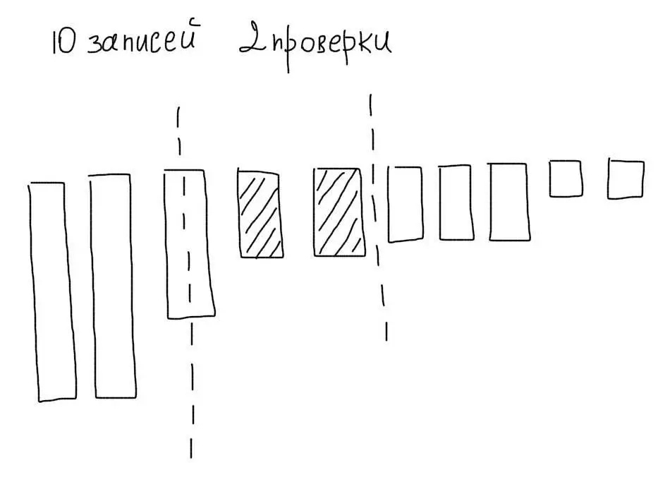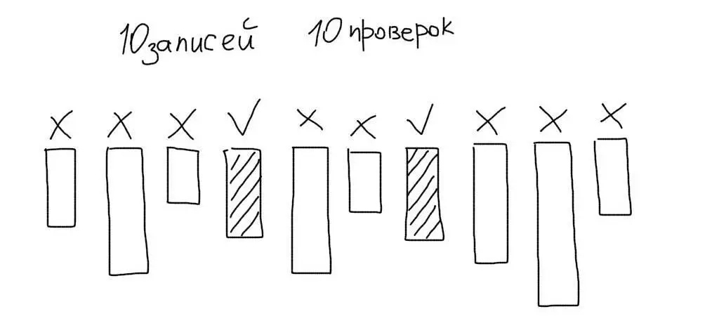 Представим, что мы отсортировали наши 10 записей по убыванию. Тогда используя алгоритм бинарного поиска, мы могли бы максимум за 4 операции отобрать нужные нам значения: