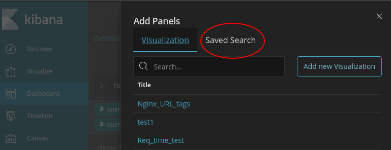 Чтобы добавить на дашборд список записей из которых построены графики, нужно при добавлении визуализации выбрать вкладку Saved Search (конечно предварительно нужно такой сохранить, а сохранятся он на странице Discover и минимально может состоять только из выбора индекса):