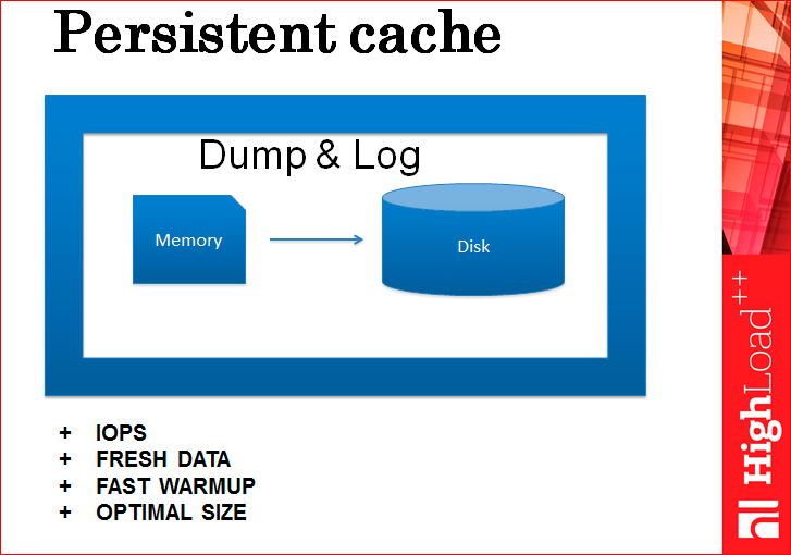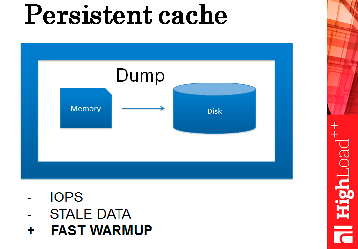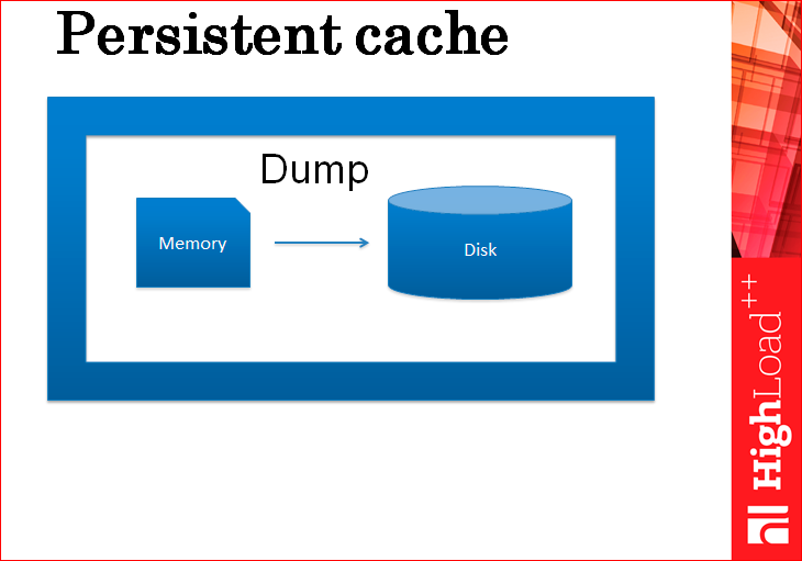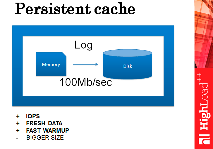 Персистенс – правильное слово. Кэш лучше просто не охлаждать, его нужно персистить, потому что кэш – хорошее и быстрое решение, за исключением нескольких проблем, включая проблему холодного старта, включая то, что он иногда недогрет, так пусть он будет всегда согрет. Как, например, в Сибири некоторые люди не глушат машины, чтобы они были всегда заведенные, потому что иначе ты ее потом не заведешь – примерно из той же оперы.