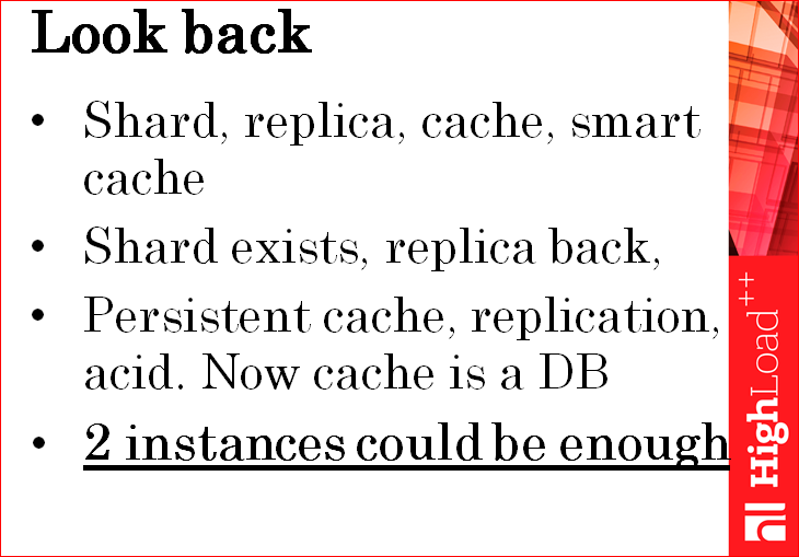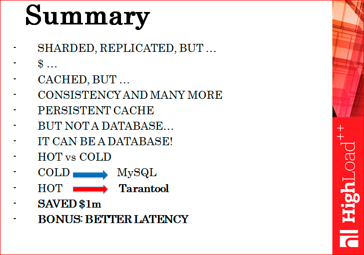 Тут краткое Summary о том, что мы сделали. Мы шардировали, реплицировали, уперлись в деньги, стали кэшировать, потеряли консистенси и еще кое-что… Сделали персистент кэш, это не база данных, но он может быть базой данных, отделили горячие от холодных данных, холодные – в MySQL, горячие – в Tarantool, спасли 1 млн. долларов и, как бонус, получили лучший юзер експириенс, потому что все стало быстрее.