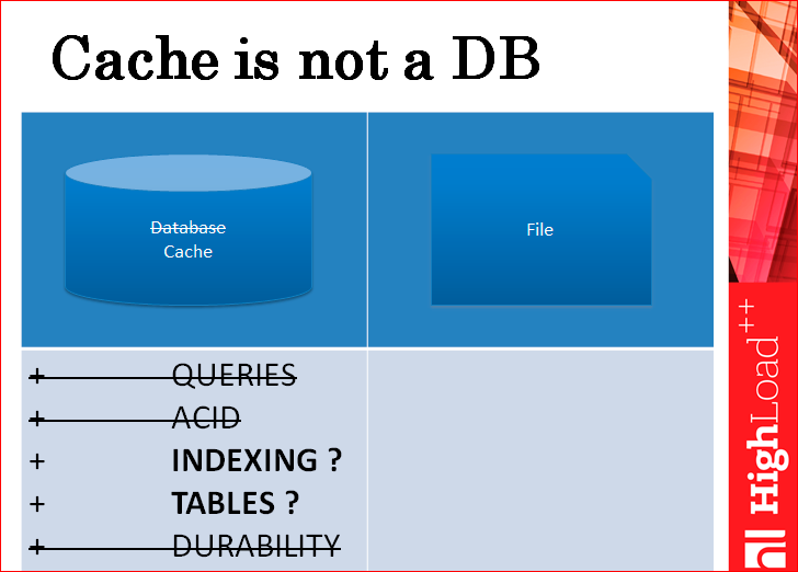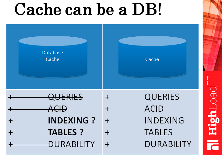 Почему еще кэш не может быть первичным источником данных? Потому что он не обладает свойствами баз данных? Мы тоже можем это сделать, мы можем все эти свойства баз данных поддержать, и кэш будет ими обладать. Помните картинку «Кэш – это не база данных»?