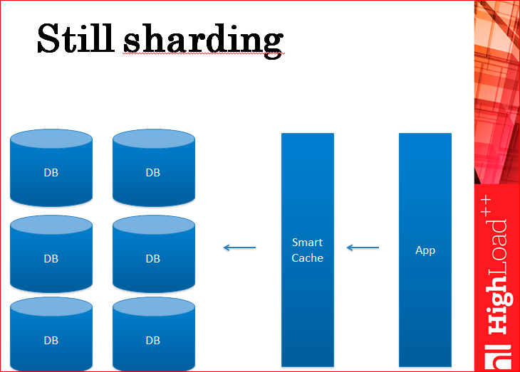 И, кстати, у вас все еще остается шардинг, потому что кэш записи не оптимизирует, потому что в кэше нельзя ничего хранить, через него все пролетает насквозь в базу данных. Ну, не насквозь, а сбоку от него, но пролетает.