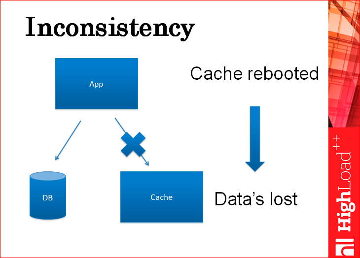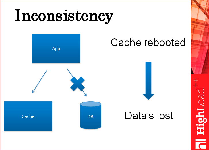 Тут картинка, чтоб показать вам, что вы можете писать сначала в базу, потом в кэш, или сначала в кэш, потом в базу. В обоих случаях у вас будет несогласованность. Смотрите: вы пишете данные в кэш, после этого ваше приложение благополучно падает и в базу их записать не успевает. Приложение поднимается и работает с теми данными, которые уже в кэше, а в базе данных их нет, но никто про это не знает. Когда кэш перезагружается (а он когда-нибудь перезагружается), вы получаете из базы данных при пустом кэше устаревшие данные.