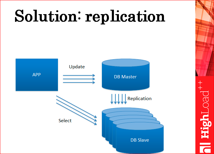 И нагрузка на запись, опять же, достигает какого-то предела, когда база данных уже не может ее держать. Поможет в данном случае репликация? Нет. Какая бы не была репликация – мастер-слейв или мастер-мастер – она не поможет нагрузке на записи, потому что каждая запись должна пройти на все сервера. Даже если там мастер-мастер, значит, сколько у вас идет суммарно запросов на весь ваш кластер, ровно столько же пойдет на каждый из серверов, т.е. вы этим ничего не выиграете.
