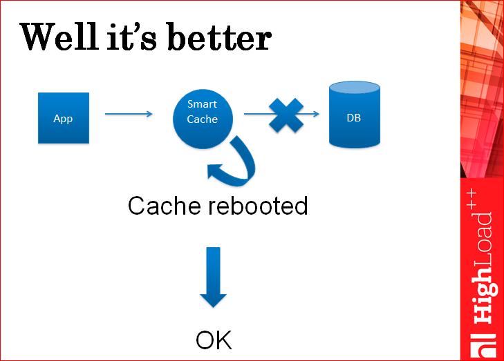 Это решает проблему нецелостности, потому что кэш сначала пишет в базу, а потом пишет в себя. Если он в базу не записал, отдал ошибку – все хорошо. Это конечно не хорошо, но данные целостные. После того, как кэш записал в базу, он в себя запишет данные обязательно, потому что он пишет в память, такого, чтобы данные не записались в память практически никогда не бывает. Вернее, бывает, когда на сервере бьется память и в этот момент все падает, и все равно вы теряете весь кэш, по крайней мере, целостность данных не теряется.