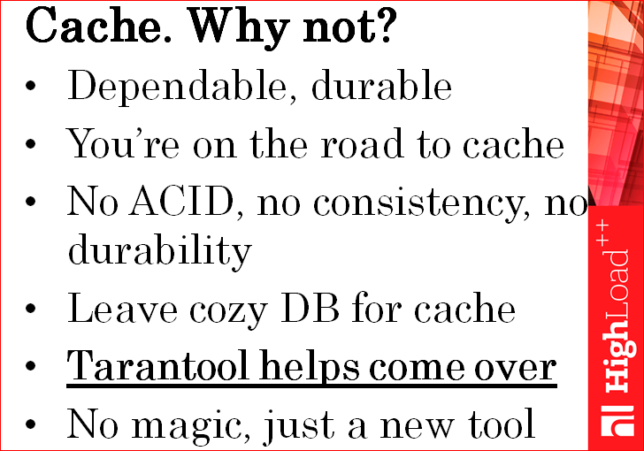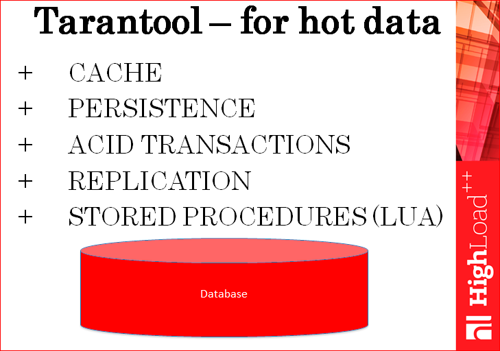 И еще тут один психологический момент – не очень хочется уходить из уютного мира баз данных в неуютный новый мир кэшей. В базе данных транзакции и т.д. Тогда, когда ваш босс злой, вы доставили кэш и как-то сразу стало неуютно. И как раз Tarantool возвращает этот уют, т.е. он, мало того, что решает проблемы неконсистанси и холодного старта. Он, как бы, возвращает вас в мир баз данных для горячих данных.