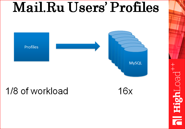 Кейс был такой: нам нужно было хранить профили пользователей. Профили пользователей – это такие маленькие кусочки информации – от 500 байт до 1 Кб на пользователя. Мы изначально стали для этого дела использовать MySQL. И стали дублировать всю нагрузку на профили, которые у нас до этого лежали в старом хранилище, на чтение и на запись на ферму из MySQL. Мы поставили ферму из 16-ти MySQL, все пошардили заранее и туда пустили нагрузку. И оказалось, что на 1/8 от всей нашей нагрузки эти 16 серверов уперлись в полки. В основном, они уперлись в полку по процессору.