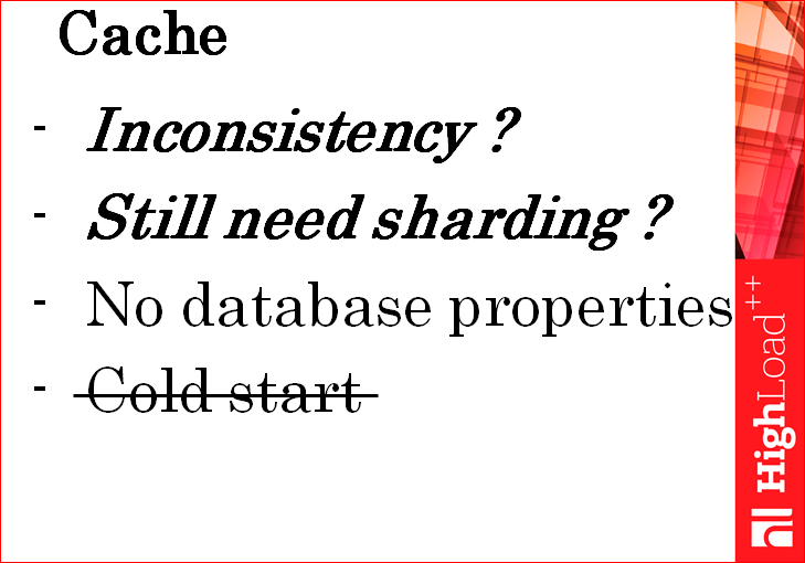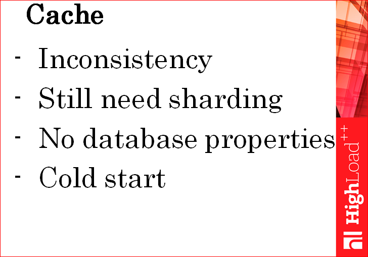 Т.е. с кэшем есть как минимум две проблемы: нет целостности данных, и вам все еще нужен шардинг.