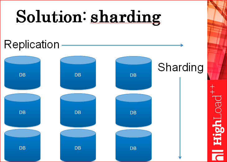 Есть много разных способов шардинга – можно резать по базам данных, можно резать по таблицам, можно резать внутри одной таблицы. Способов – миллион. Каждый использует тот способ, который ему удобней.