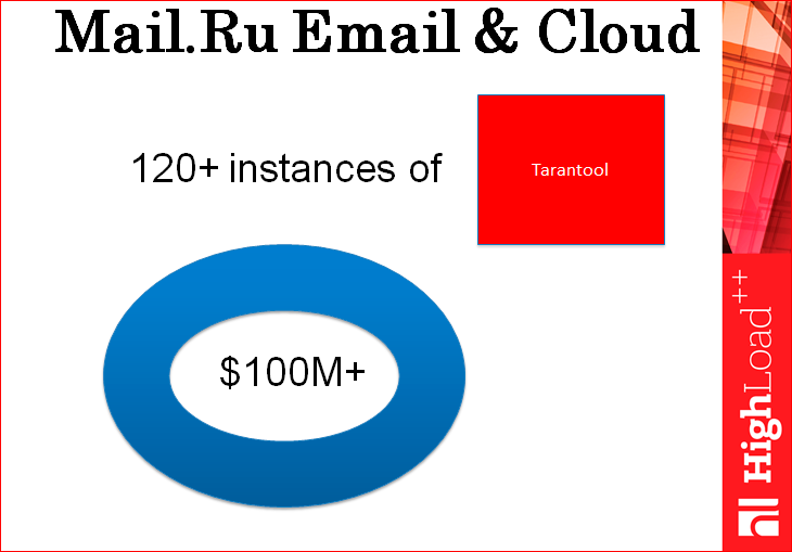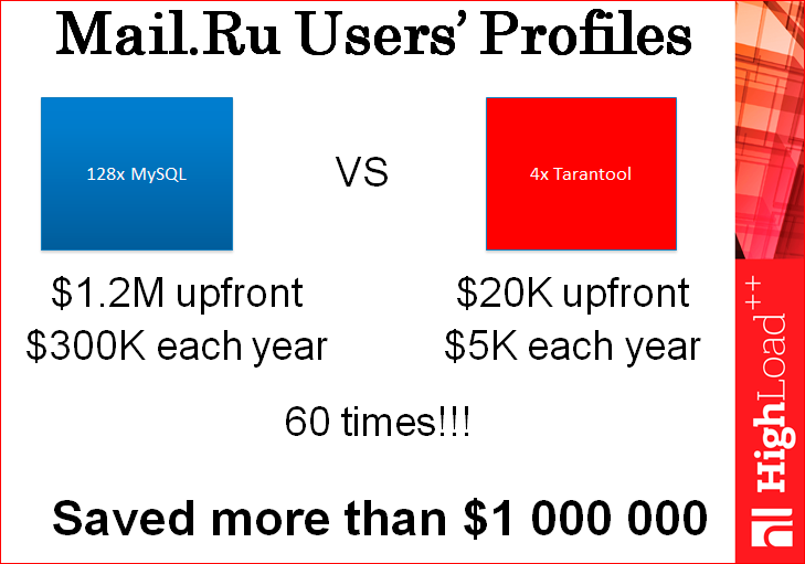 У нас суммарно в облаке и почте больше 120 инстансов Tarantool, серверов прямо с Tarantool, которые используются для разных фич, для очень большого количества фич. Если бы мы все это хранили в MySQL или в любом другом SQL, то это были бы сотни миллионов долларов, просто, если экстраполировать имеющиеся цифры.