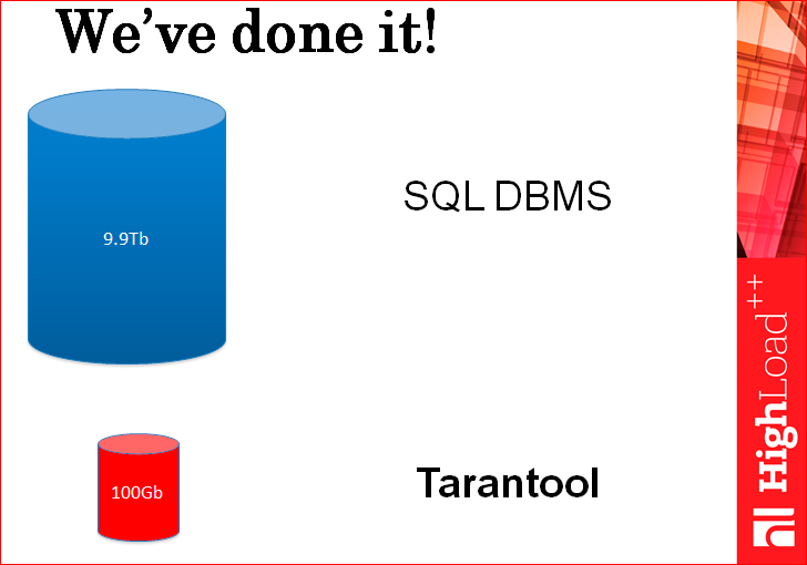 Мы пытались их тюнить так и сяк, но по факту, все, что мы достигли – это 16 серверов на 1/8 нагрузки, т.е. на весь кластер, на всю нагрузку потребовалось бы 128 MySQL серверов. Мы подумали, что это дороговато – это больше 1 млн. долларов. И мы просто поставили несколько серверов с Tarantool и туда пустили всю нагрузку. В тестовых целях, дублировали. И оказалось, что они без проблем ее тянут целиком. Даже одного сервера было достаточно. Поставили просто 4, потому что мастер, реплика + еще пара, на всякий случай. Мы обычно перезакладываемся всегда по нагрузке.