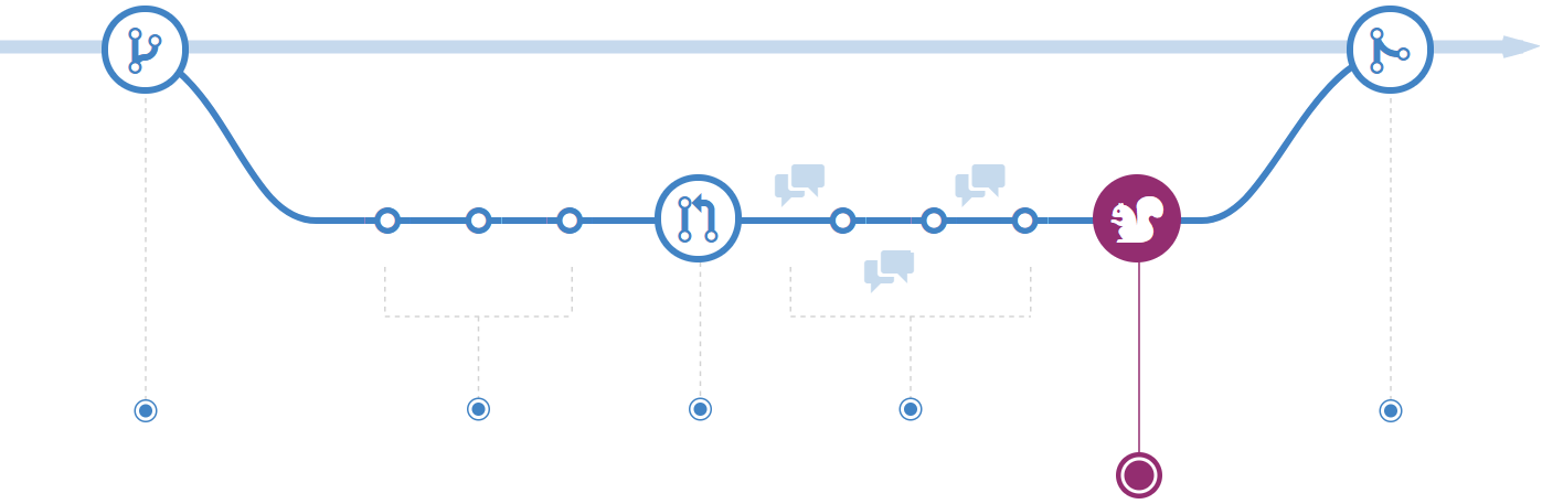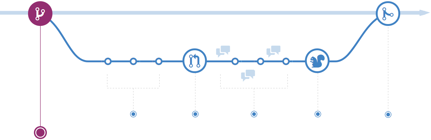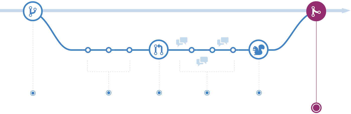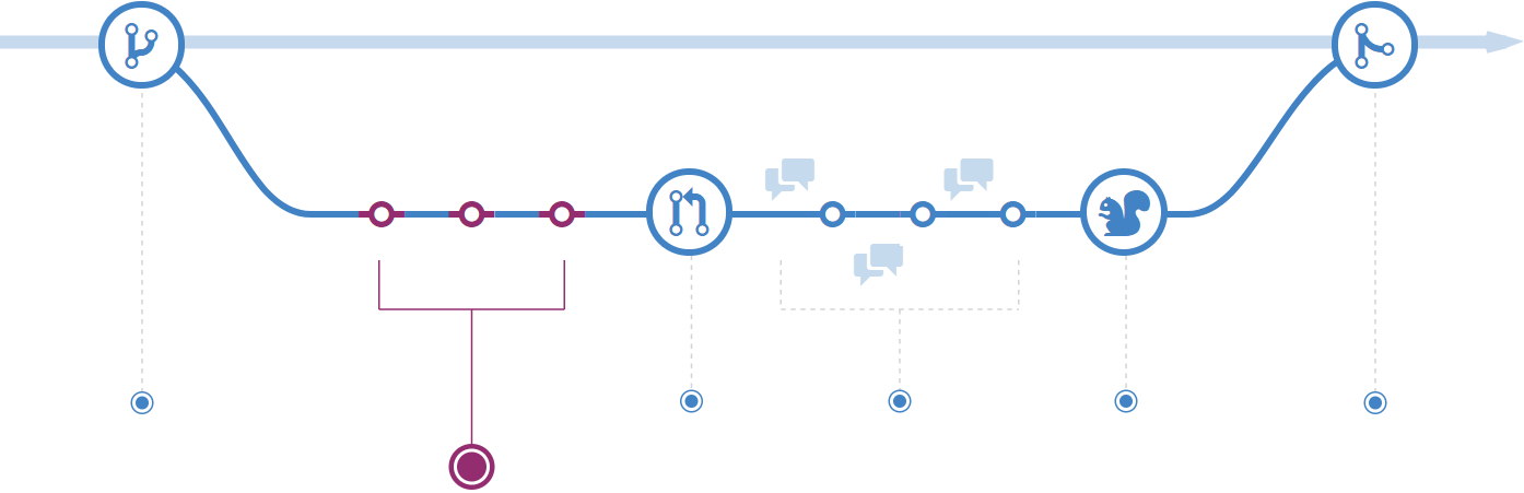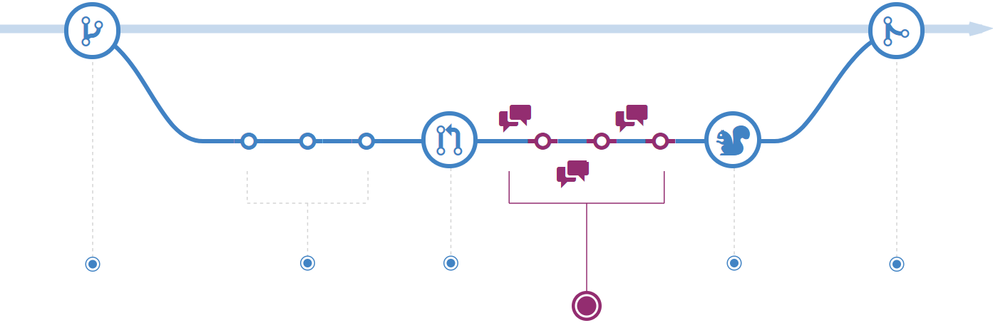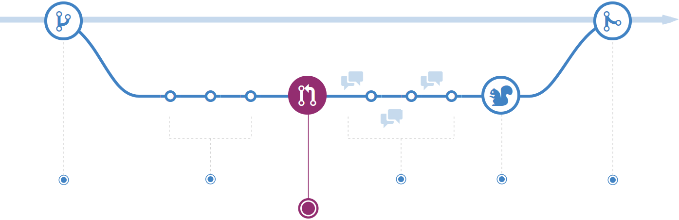 После открытия запроса на слияние команда рассматривает изменения, задавая вопросы и оставляя комментарии. Возможно стиль кодирования не соответствует принятому соглашению. Возможно отсутствуют модульные тесты. А возможно все выглядит хорошо и не вызывает нареканий. Запросы предназначены фокусировки обсуждения именно на предлагаемых изменениях и группировки вместе с ними.