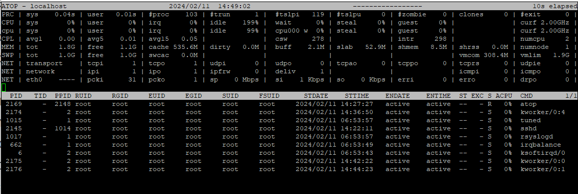Если вам этого недостаточно, можно посмотреть полный снимок нагрузки на сервер командой:atop -r путь до лога, можно сразу указать временные рамки.