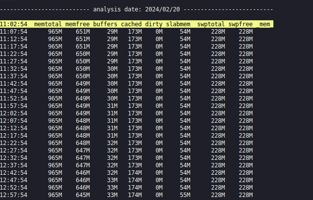Пример. Нагрузка на RAM с 11:00 до 21:00 20 февраля:atopsar -r /var/log/atop/atop_20240220 -b 11:00 -e 21:00 -m